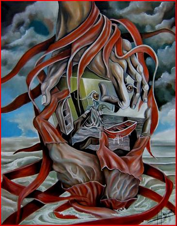 Technique : Huile sur toile Dimensions :70 cm x 90 cm Année: 2007 Référence / numéro d'article : 02008 0052 Prix : NON DISPO Description : Toile , un peu personnelle, des mains œuvrent et me forgent ...Le sauvetage de mon âme passera t-il par une simple barque, ou retournerai-je au fond de la pièce vers l’issue de secours? |